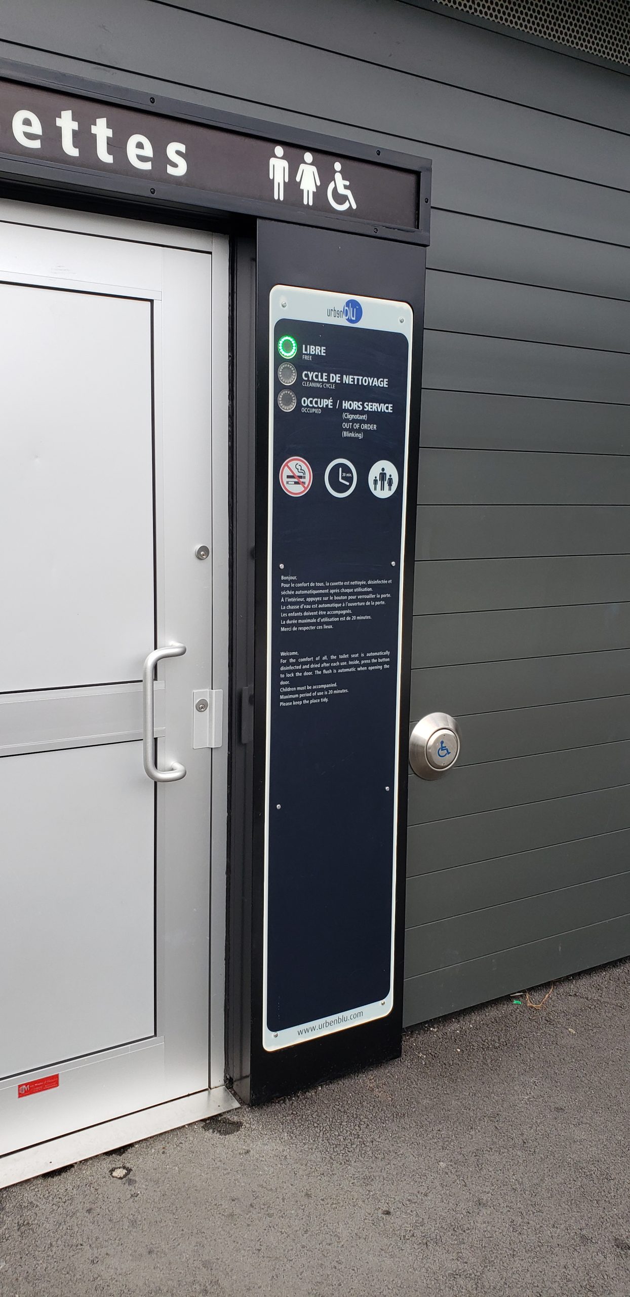 - Once inside, you will hear voice instructions. The self-cleaning restroom is designed for contactless use to increase hygiene levels and limit the spread of any germs and viruses.