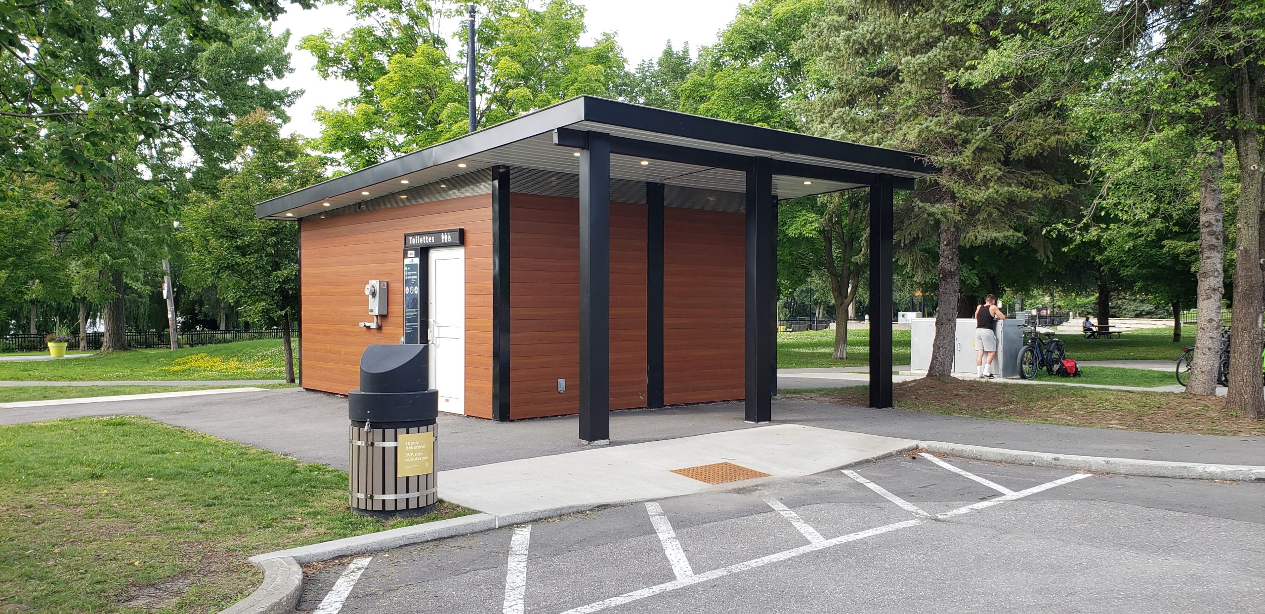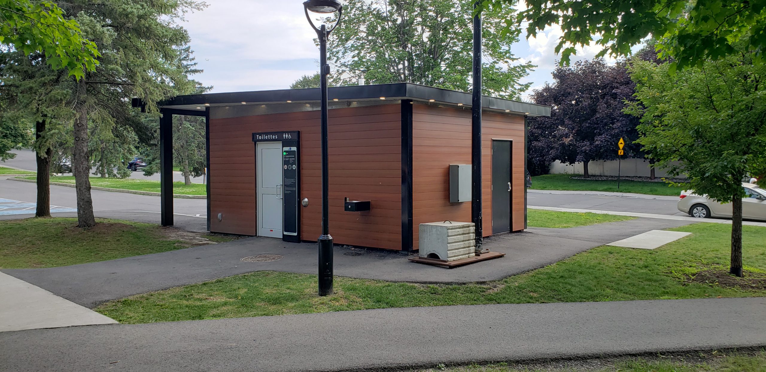 Nous avons donc suggéré un modèle « double toilettes » avec fonctions intelligentes, c’est-à-dire qu’il se nettoie seul après le passage d’un usager (le plancher et les toilettes), et comprend deux toilettes universellement accessibles, dont une de dimension suffisante pour accueillir une personne en fauteuil ainsi que son accompagnateur et incluant une table à langer pour adulte, ce qui est extrêmement rare pour une installation de parc. Une fontaine à eau (abreuvoir) a été ajouté pour répondre aux besoins.